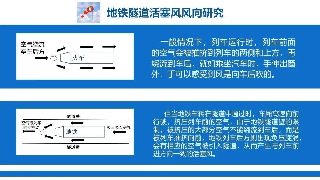 地铁隧道活塞风风向研究:一般情况下,列车运行时,列车前面的空气会被推挤到列车的两侧和上方,再绕流到车后,就如乘坐汽车时,手伸出窗外,手可以感受到风是向车后吹的。