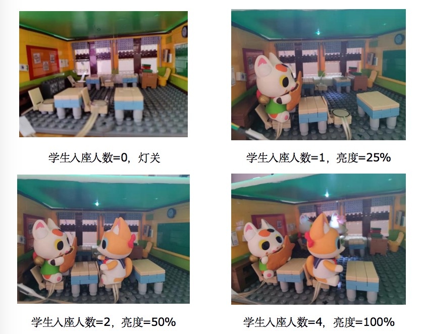 设计利用乐高型积木拼搭教室模型,KT板做天花板,天花板中间安装LED灯,每个座位上贴上一枚电阻式薄膜压力传感器,玩偶模拟学生,从而进行仿真实验。经过系统仿真与调试,实现了智能计数下的照明亮度自动调节功能。