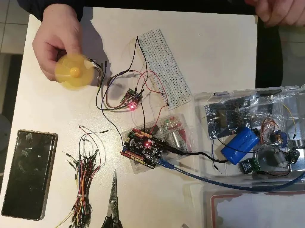 于是项目组成员将在学校特色课程《极智创客》中所学习的科创知识、技能与方法投入实践,研发智能低碳设备。首先基于现实问题设计并发放问卷,根据调查结果进行头脑风暴,提出多种设计方案,再自主阅读相关资料进行学习,对各种元器件进行初步调试来保证其能够正常工作,通过这些预实验明确了装置的基本功能和原理。
