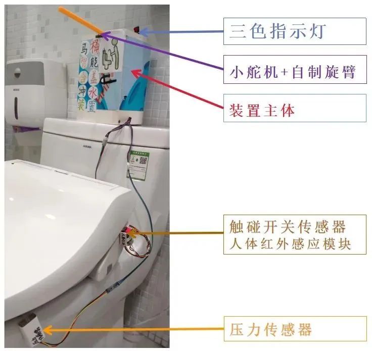 装置中集成了人体红外感应模块来检测是否有人在使用马桶,用压力传感器来判断使用马桶的情况;并安装了三色指示灯来显示其运行状态;内置电池模块可以让装置方便快捷地安装在现有的马桶上,无需更换家中已有的马桶,是一种低碳环保的解决方案。