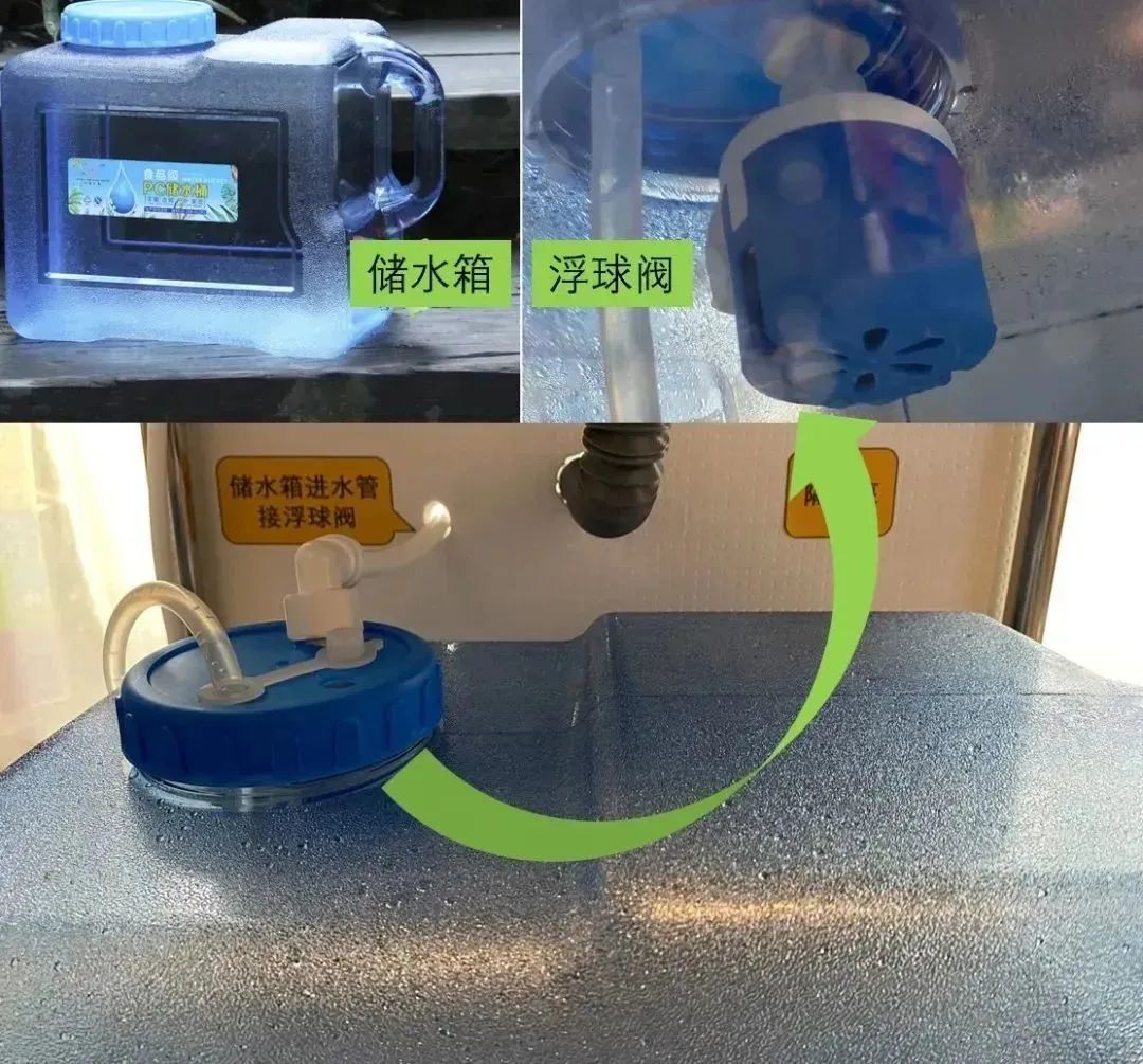 首先,要有一个装有浮球阀的储水箱:根据家庭水管容积的计算和实验,一个三口之家每天淋浴需要30升储水量,大约是50X30X20立方厘米大小的体积。这样的水箱可以放在洗手台盆下方的橱柜内,隐蔽、不占额外空间。为了防止水溢出,本发明在进水口设计了浮球阀。它是纯机械结构的,无须电源,水位上涨到箱顶时,浮球上升即可关闭注水孔。