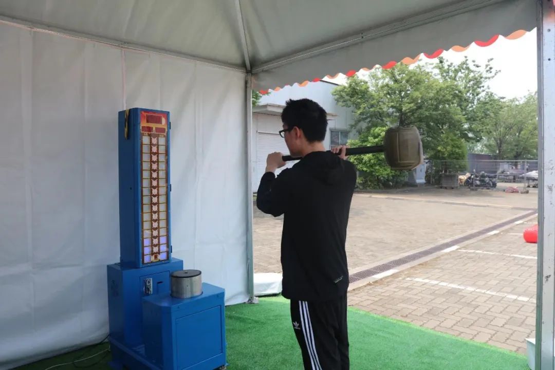 外场摊位呈半圆形排开,投篮、大力锤、保龄球……游戏区的花样玩法吸引不少市民参与。“这个大力锤不是谁都能玩的,至少有10斤。你看,显示屏上总共有15格,我才打到7格。”市民潘嘉越说。