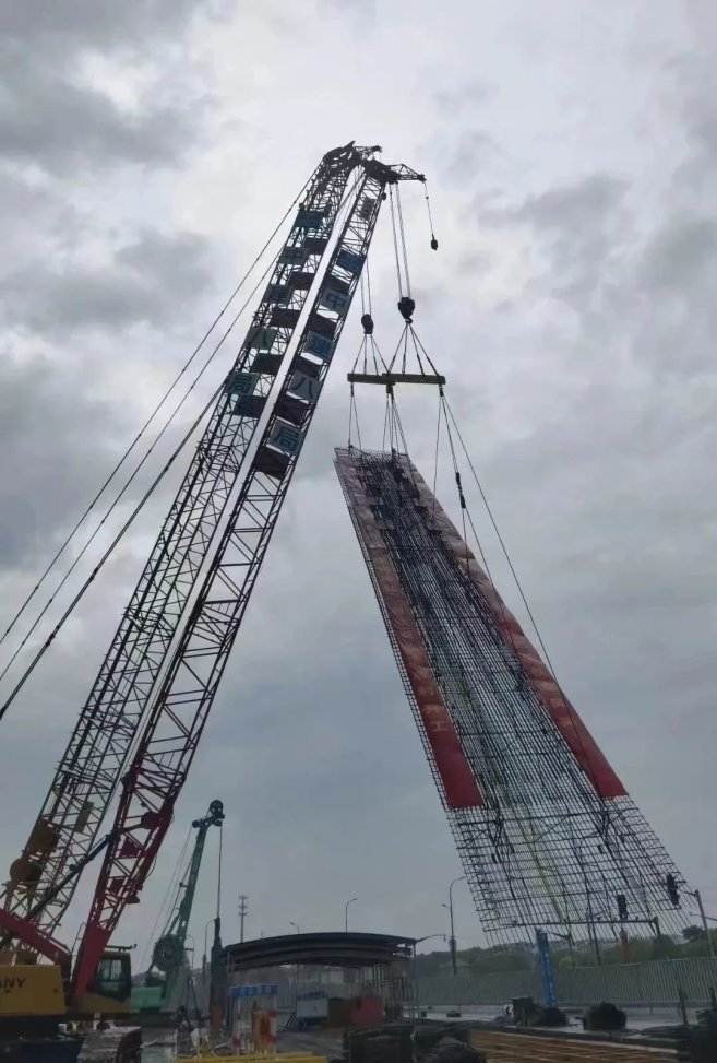 首幅地连墙施工中,项目部调用大型机械设备,将长41米、宽6米,总重40.15吨的钢筋笼成功下放,6小时完成了254立方米混凝土浇筑。