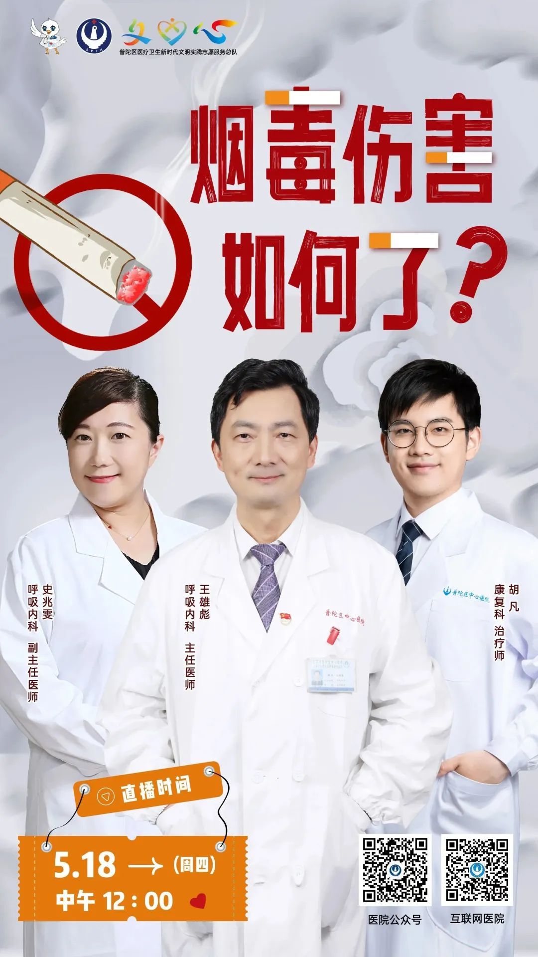5月18日(周四)12:00,普陀区中心医院5G健康直播间将以《吸烟伤害如何了?》为主题,由呼吸内科主任医师王雄彪、副主任医师史兆雯、康复科治疗师胡凡一起搭档,带你了解烟毒危害,解析吸烟步骤。观众朋友们,让我们不见不散~