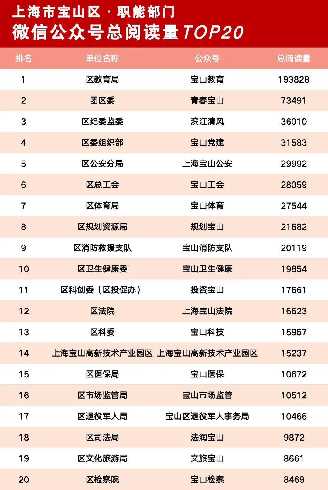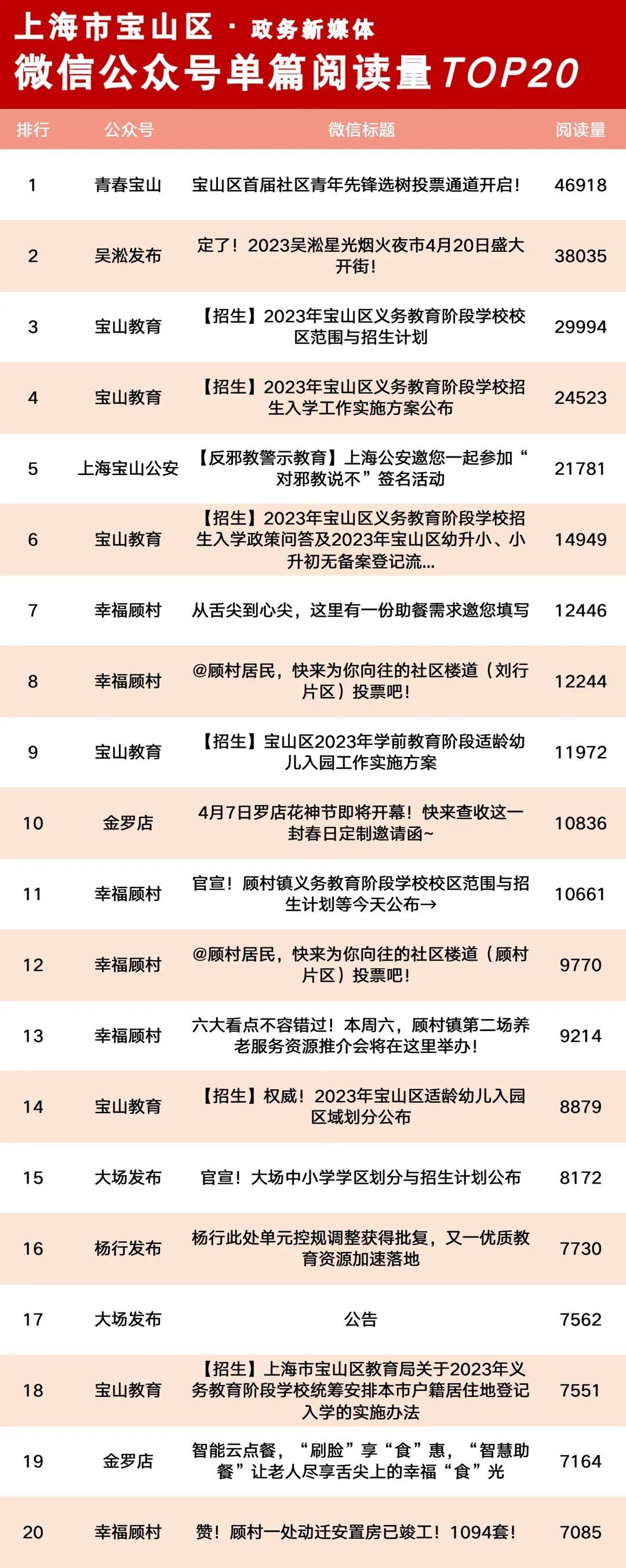 TOP20里,宝山教育、幸福顾村各占6席,大场发布、金罗店各占2席,其余公众号也表现优异。
