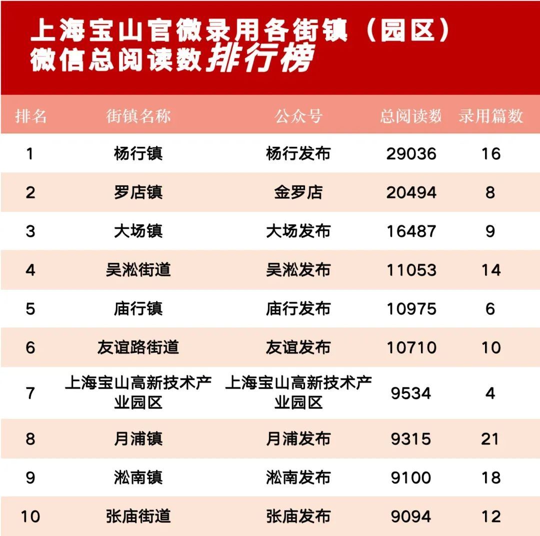被录用阅读数是指全区各街镇公众号被“上海宝山”录用转载后的文章阅读数。4月被录用阅读数榜单中,杨行发布以总数29036位居榜首,金罗店、大场发布分别获得第二名和第三名。