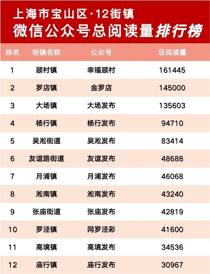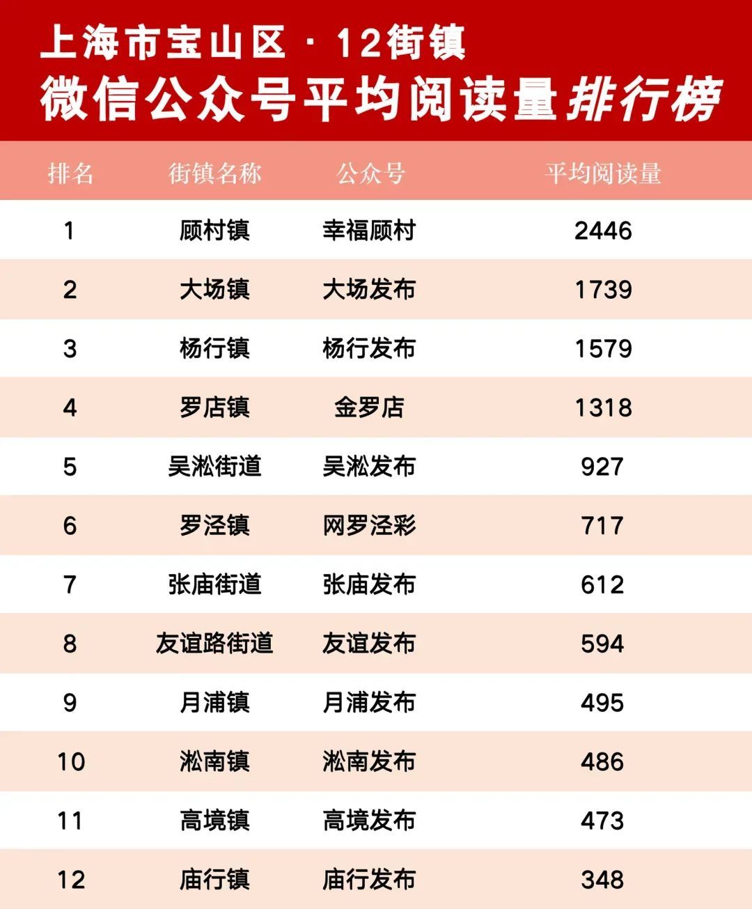 平均阅读量,是指一个公众号的单篇平均阅读数量,在一定程度上反映了该公众号的文章质量和粉丝忠诚度。在全区12个街镇4月平均阅读量榜单中,幸福顾村以平均阅读量2446位居榜首,大场发布、杨行发布分别获得第二名和第三名。
