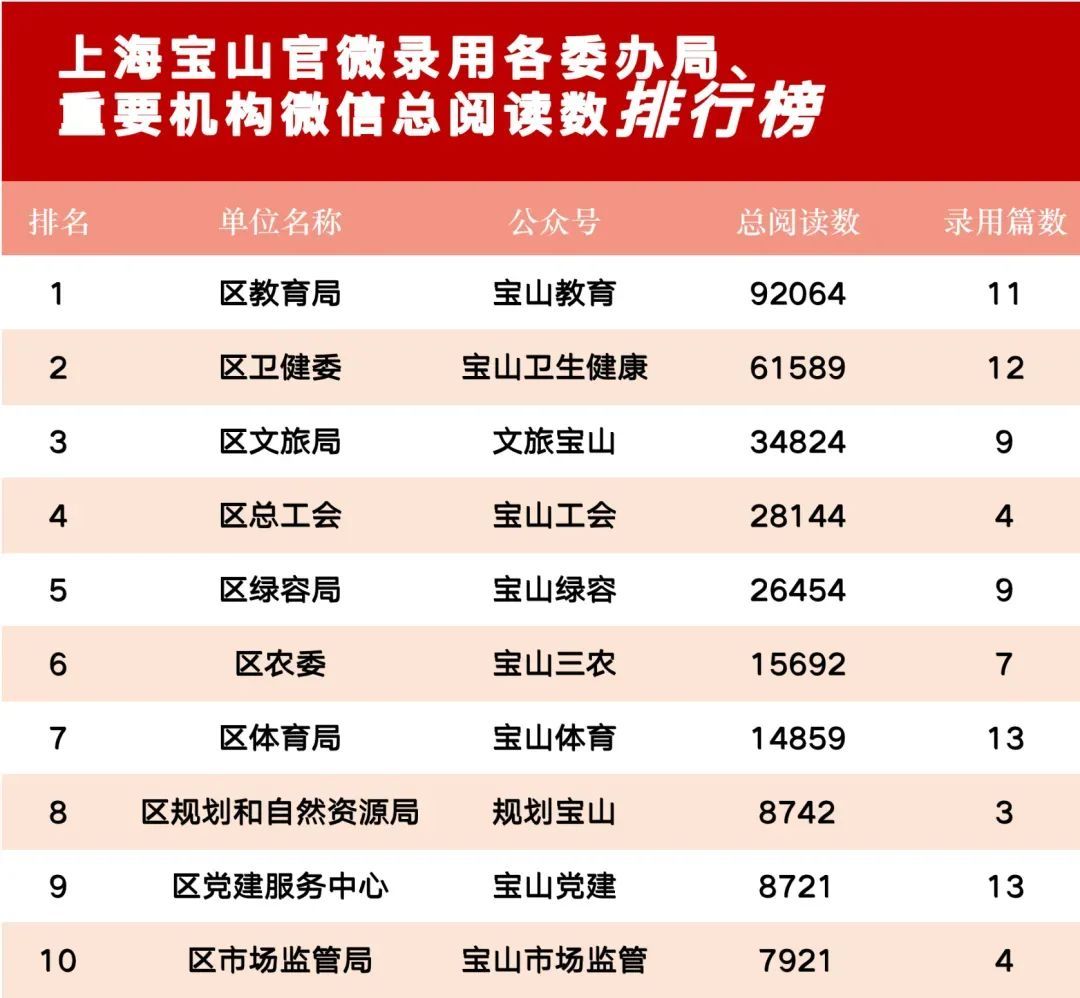 被录用阅读数是指全区各委办局及重要机构公众号被“上海宝山”录用转载后的文章阅读数。4月被录用阅读数榜单中,宝山教育以总数92064位居榜首,宝山卫生健康、文旅宝山分别获得第二名和第三名。