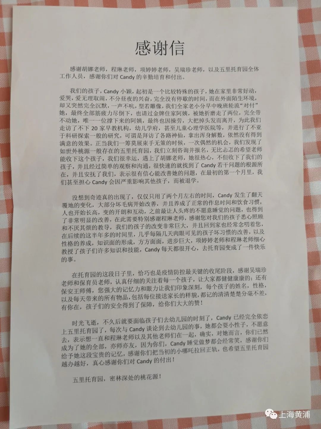 地处市中心的五里桥社区托育园,是黄浦区首家公建民营的非营利性托育园,主要为街道辖区内“人在户在、且父母为双职工家庭”的2—3岁幼儿提供托育服务。不久前,五里桥社区托育园园长胡娜收到了一封感谢信。