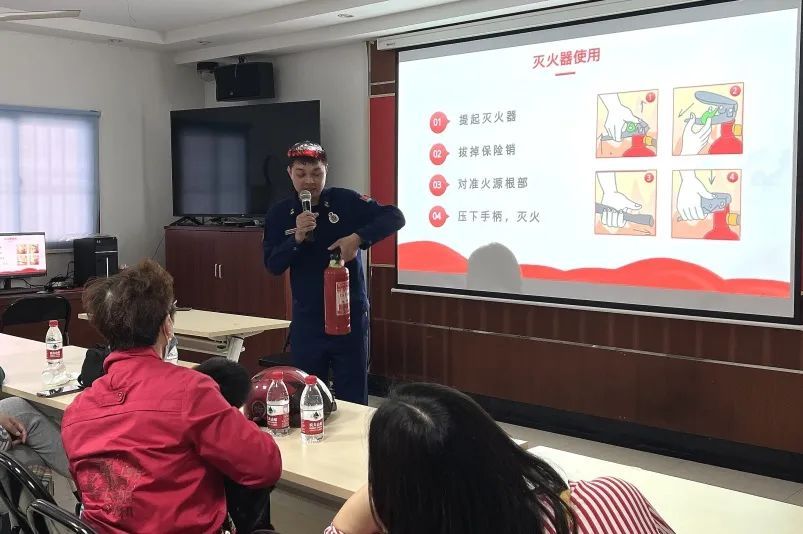 此外,欧阳松鹏向居民们现场演示了灭火器的使用方法。居民王阿姨表示:”这些知识都很实用,平时经常在楼道里看到灭火器,根本不会使用。今天学会了灭火器的正确使用方法,也提高了安全意识。”