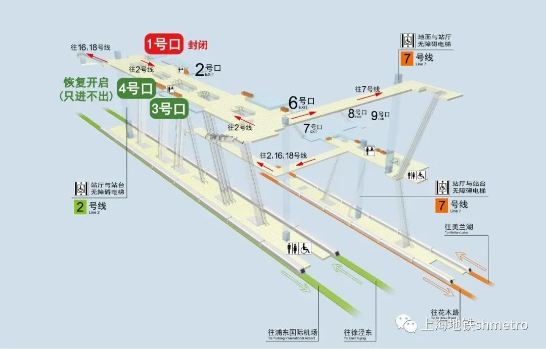 自5月20日运营开始,2号线龙阳路站北侧1号口关闭,同步启用南侧4号进站口。