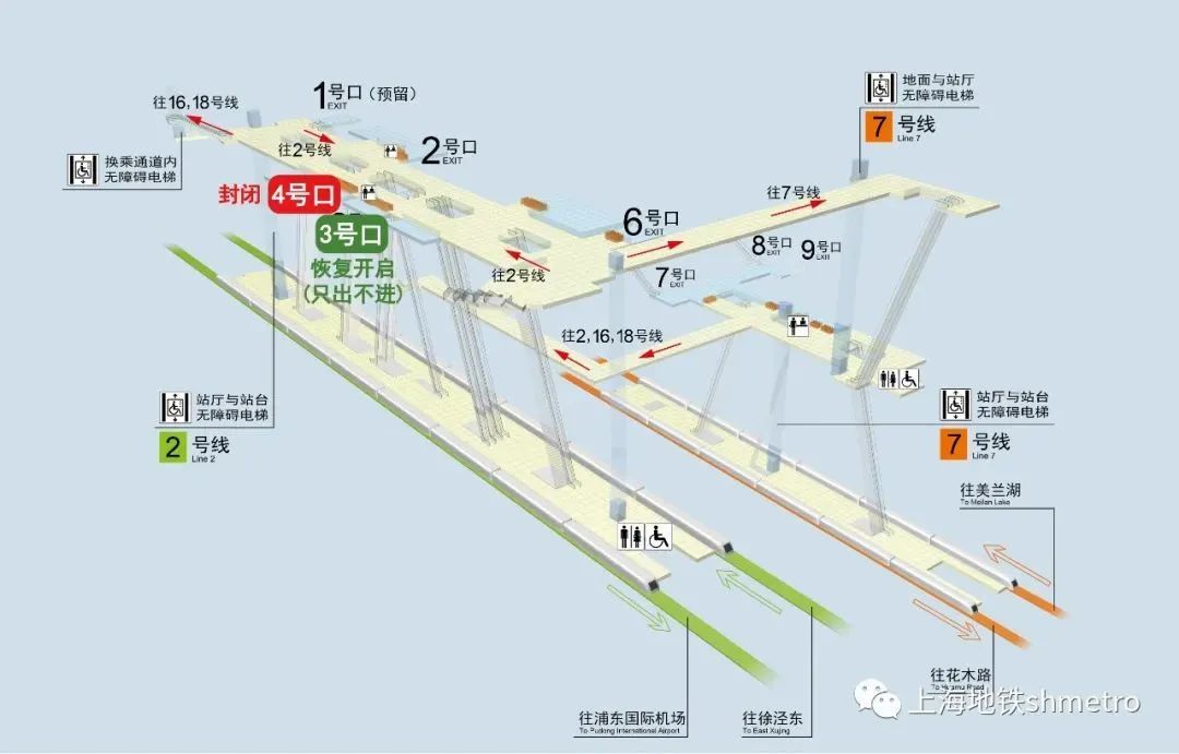 据申通地铁集团消息,为配合施工改造,5月16日起,地铁2号线龙阳路站多个出入口陆续有调整,详见下文↓
