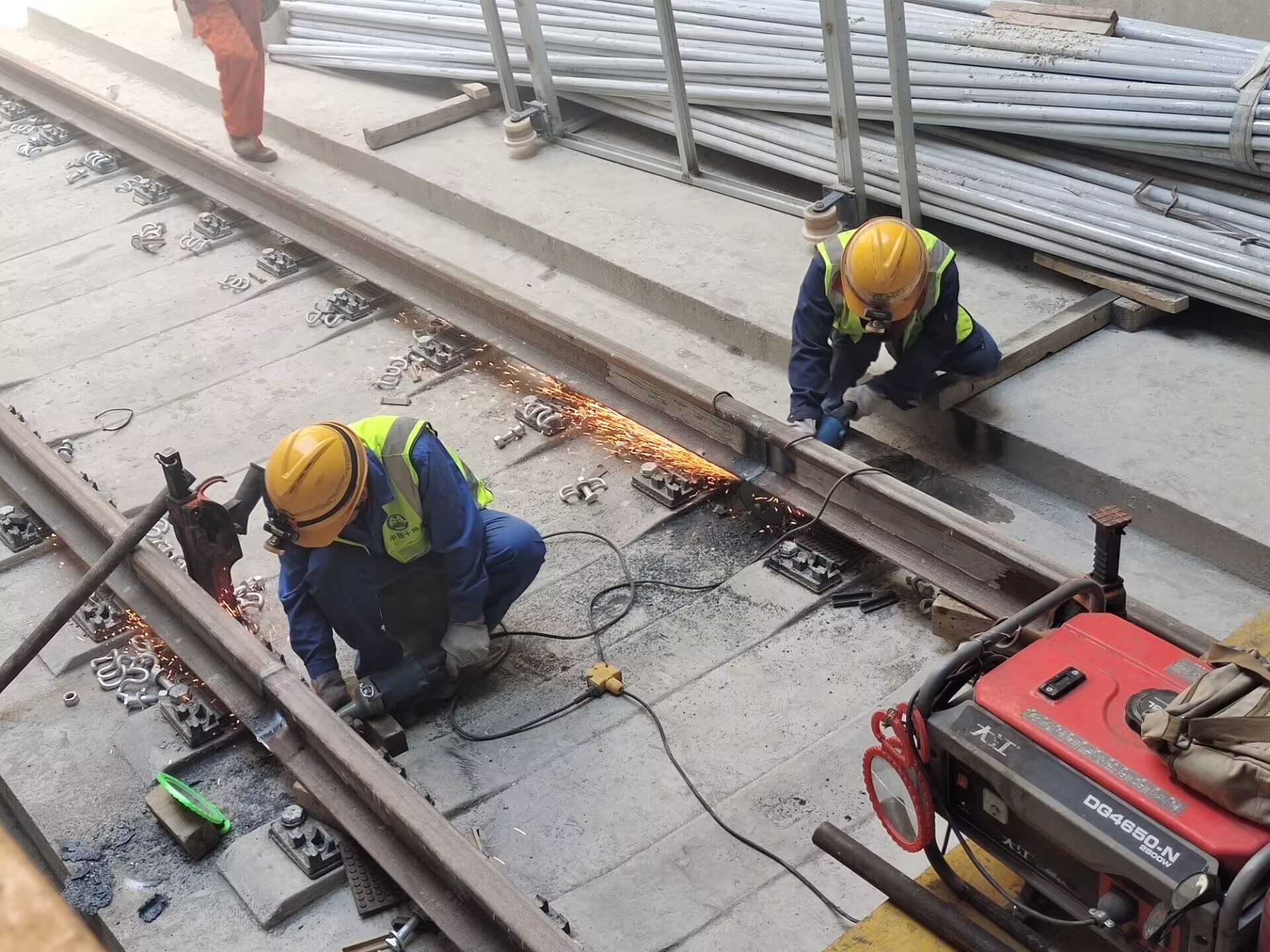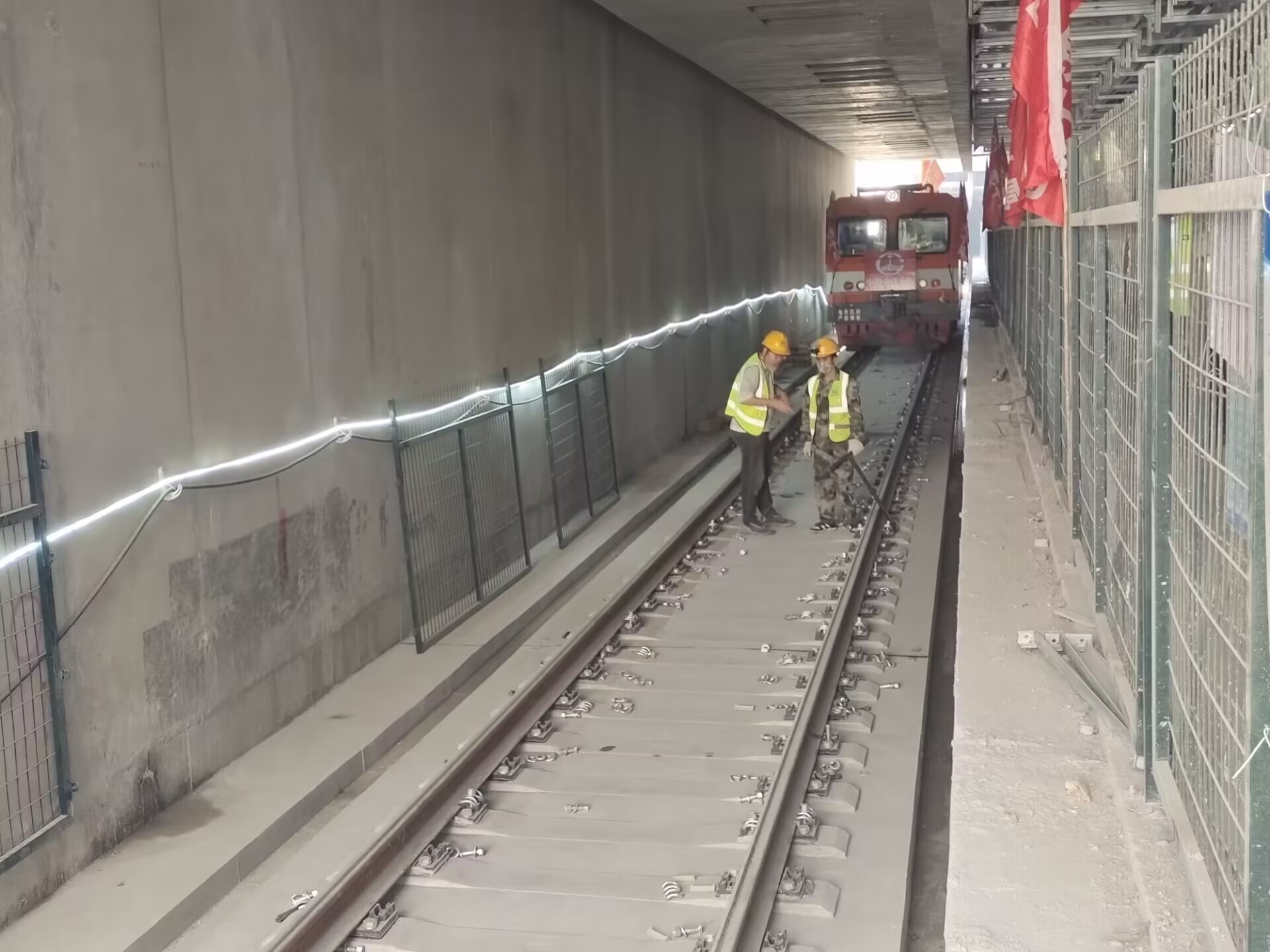 本段铺轨是中铁十局第一次施工地铁铺轨项目,为保障顺利完成节点工期,项目部上下一心,投入铺轨设备20台套,管理及施工人员百余人。坚持节点目标不动摇,通过倒排工期,动态调整工筹,不断优化施工工艺,场地移交一段轨道铺设一段,区间对向施工、两端同时作业,有效减少交叉作业对施工的影响。为保障施工进度,针对该线路铺轨基地少、铺轨方向单一、区间长度长等特点,采用了道床混凝土运输车、专用混凝土料斗等设备进行施工。实行领导现场带班制度,抓好现场技术监督和安全管控,通过交叉批点、错峰施工、防护到位等方式,提前完成“长轨通”节点目标。中铁十局济南地铁3号线二期铺轨工程项目总工张宁介绍。