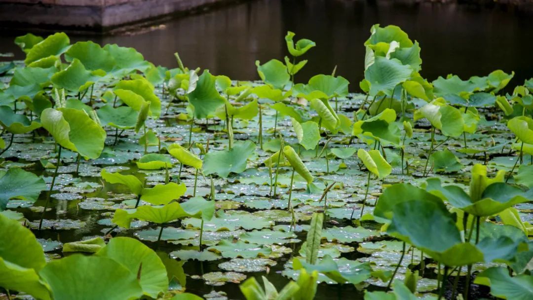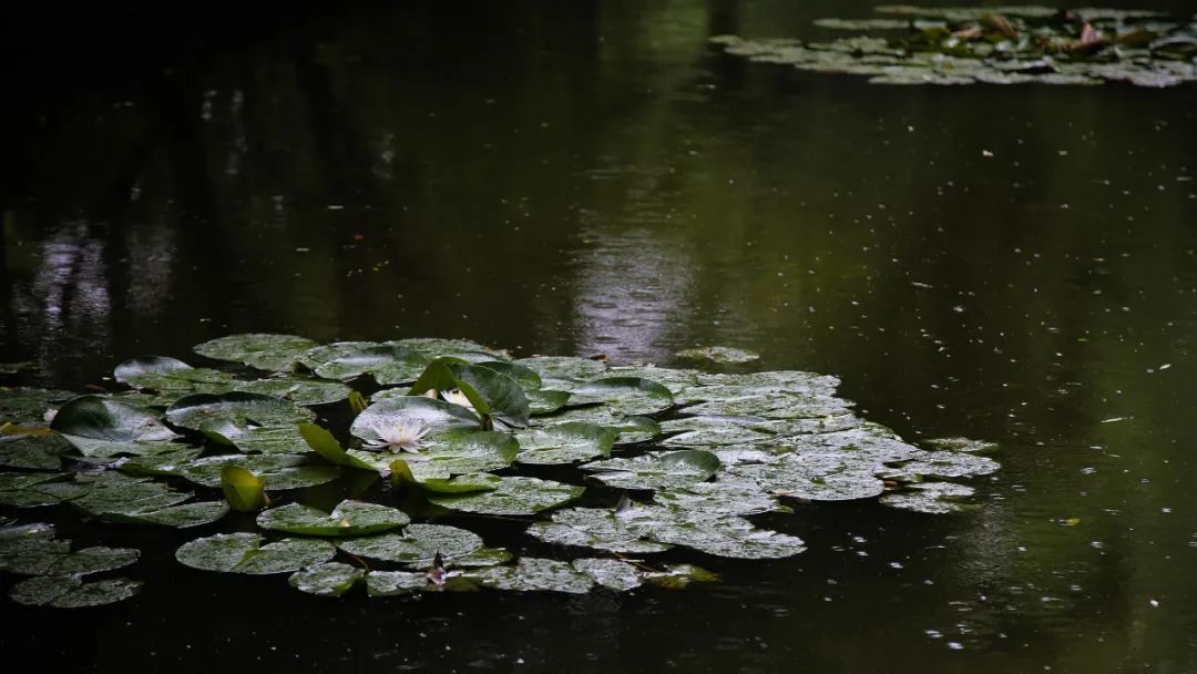 在秋霞圃,雨点落在清镜塘池面,泛起层层涟漪。碧绿的荷叶在风中嫣然摇动,将雨水团成晶亮的珍珠,倾倒在池水中。