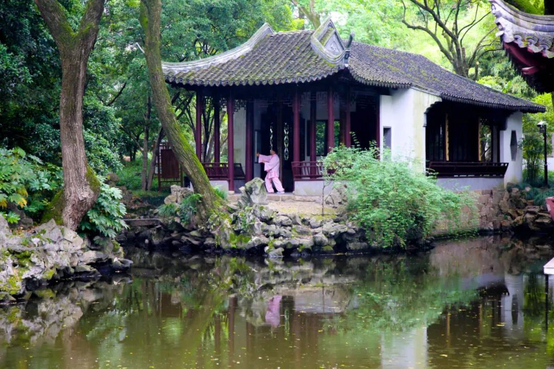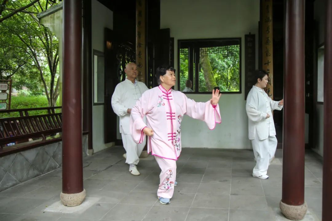 来到形似舟楫的池上草堂,只见几位太极爱好者在房檐下,全神贯注地练习招式。
