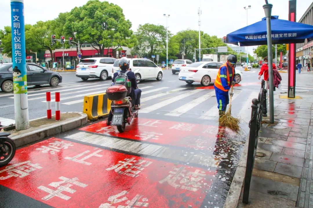 今天(5月17日)一早,嘉定博乐路塔城路口由于降雨出现积水,环卫工人正马不停蹄地清理路面积水和雨水篦周围的落叶,保障市民出行通畅。