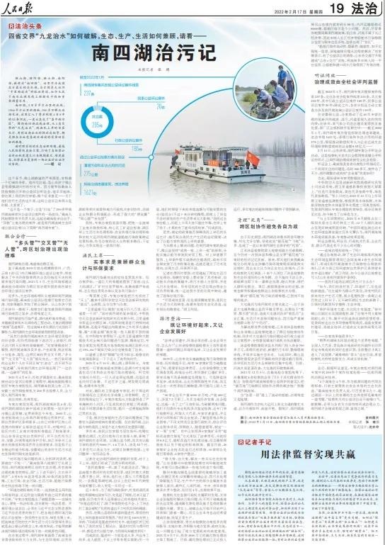 2022年2月17日,《人民日报》整版报道南四湖治污,文中给记者留下深刻印象的是“人与湖和谐共生的治理智慧”。