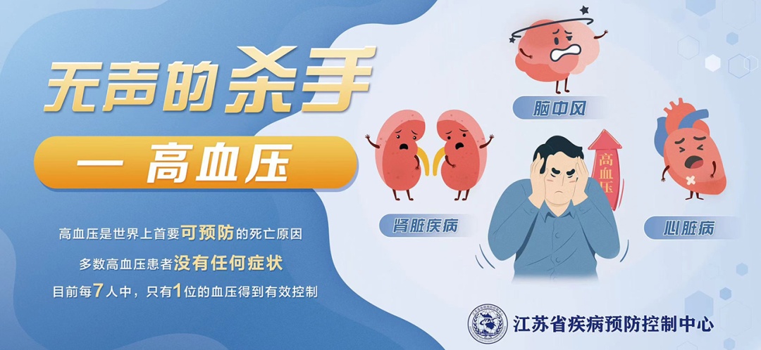 高血压是一种以动脉压升高为特征,可伴有心脏、脑和肾脏等器官功能性或器质性改变的全身性疾病,是心脑血管疾病最主要的危险因素,且因大多数高血压患者并没有任何症状,所以高血压常被称为“无声的杀手”。江苏省疾控中心慢病非传染性疾病研究所所长周金意介绍,“2018年,中国慢性病与危险因素监测显示,江苏省18岁及以上城乡居民高血压患病率、知晓率、治疗率和知晓者的治疗率分别为32.3%、53.2%、45.7%和85.8%,但高血压控制率仅为19.6%。”