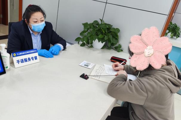 “你好,请问有什么需要帮助的?”日前,中心手语服务窗口接待了前来咨询业务的丁阿姨(化名),因当天为双休日,不在手语视频服务时间段内(周一至周五9:00—11:30,13:30—16:00),工作人员用手语简单打招呼并询问需求后,将《信息无障碍沟通记录本》递给了丁阿姨,让她通过文字表达自己的办事需求。