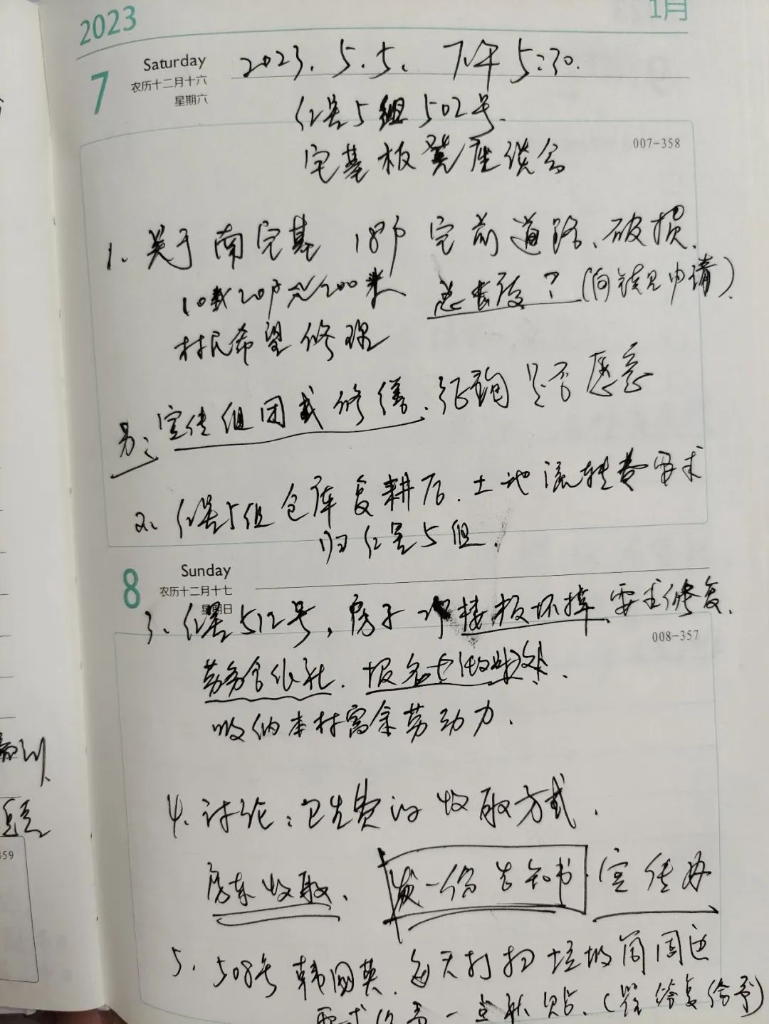 村民们会将生活中遇到的实际不便、矛盾和对村里事务的想法等放到“长凳夜话”上进行讨论辩解和协商解决,“我们家门口的窨井盖坏了,有人路过的话很容易踩空,太危险了。”“还有红星五组垃圾箱少了个棚顶,一下雨垃圾桶里都是水。”大家你一言,我一语,班子成员耐心倾听,在民情记录本上仔细记下大大小小的问题,往往第二天,村民们就能看见自己反映的问题得到了及时整改。