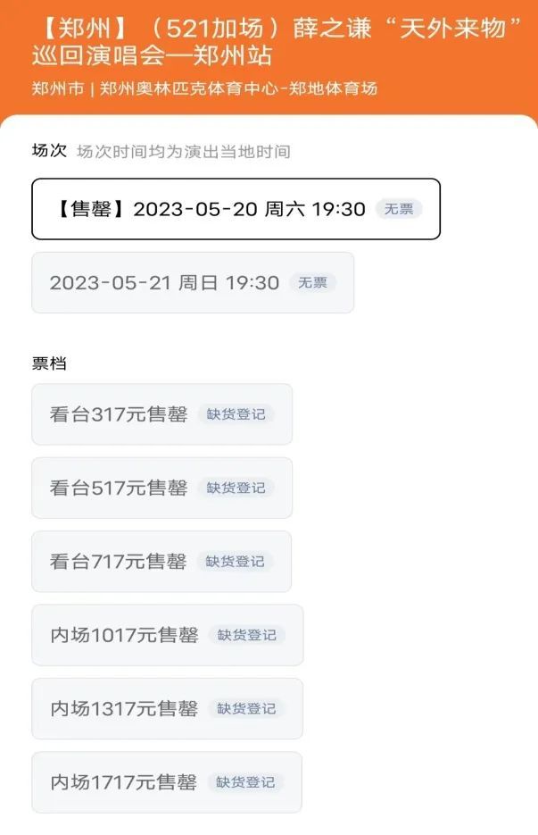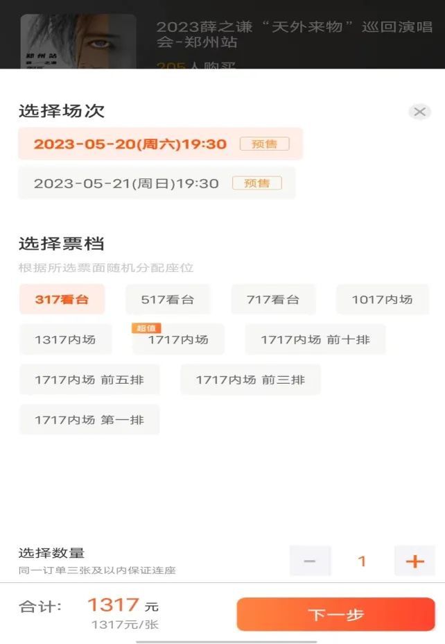 大量消费者反映,但凡有点热度的明星开演唱会,正常价格很难抢到门票,再犀利的抢票操作也是白费一场,几秒钟就会显示“缺货”“售罄”“无票”,大多数消费者只能扮演“陪抢”的角色,继而转向二级票务市场。但二级票务市场的价格动辄加价数百上千,“上万”的天价门票也是屡见不鲜,溢价相当夸张,而且价格变动频繁,一天一价。如某明星原价317看台的门票,在有票平台上最高竟然要1317元,直接翻了“两番”多。