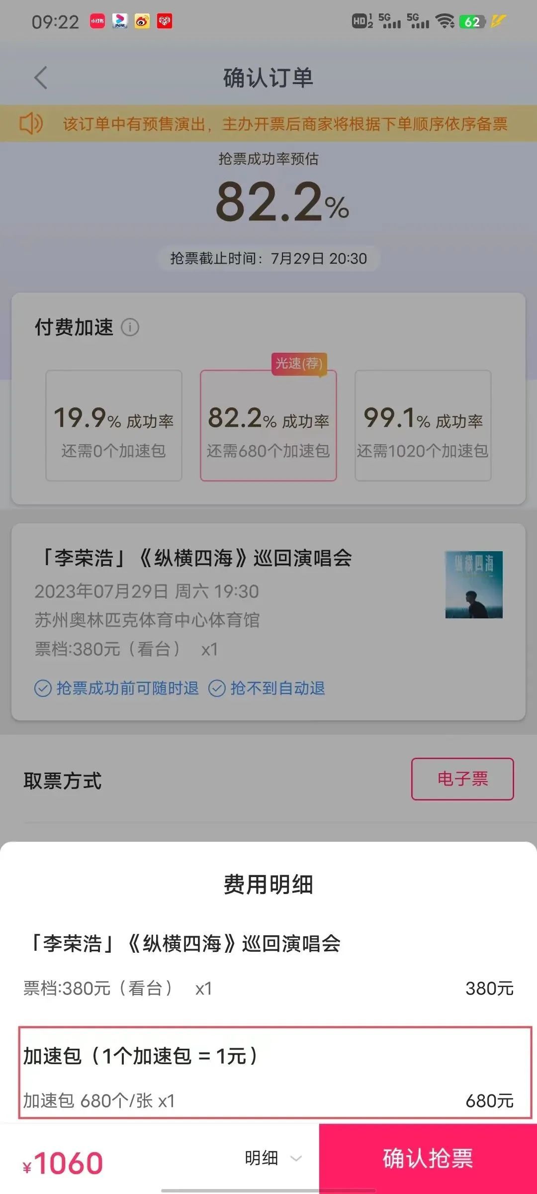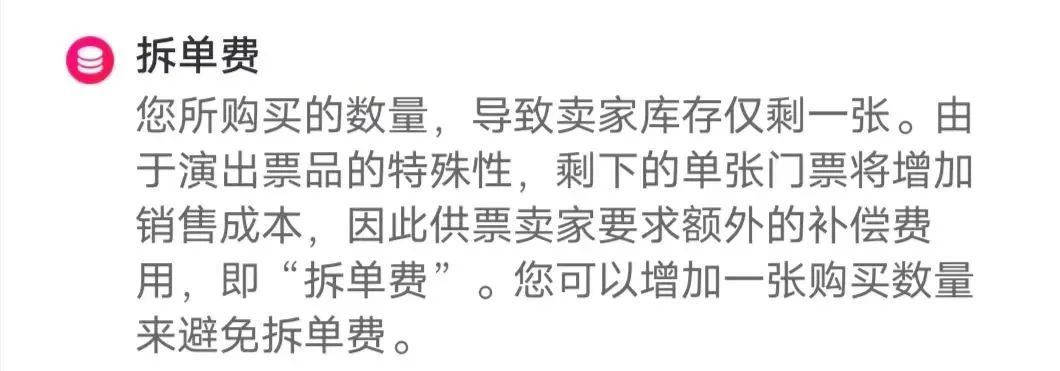 同时,我们好奇何为拆单费?平台对此的解释是:您所购买的数量,导致卖家库存仅剩一张。由于演出票品的特殊性,剩下的单张门票将增加销售成本,因此供票卖家要求额外的补偿费用,即“拆单费”。您可以增加一张购买数量来避免拆单费。按照普通理解认知,门票难道不是以“张”为单位进行售卖的吗?单张门票销售需要增加销售成本从何谈起?而“加速包”其实也是平台赚取“概率钱”,属于稳赚不赔。消费者实际对抢票成功率的高低、真假根本无从辨别,只是被不断灌输“加钱=增加概率”的概念,被诱导着支付高额费用。