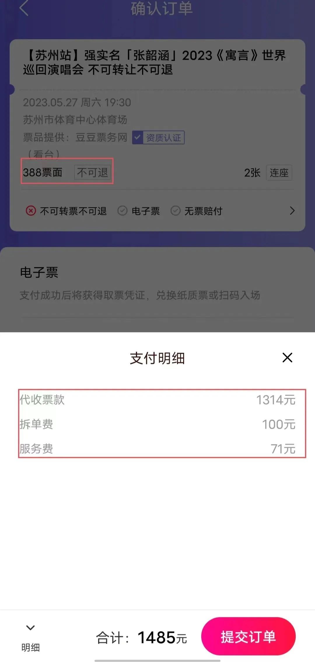 除了高溢价外,消费者在购票、取票环节也会遭遇诸多问题。比如订单暗藏代收票款、服务费、拆单费、加速包等费用,消费者在急着抢票的情况下,很容易就忽视掉实际支付金额高出票面价值,且有额外增加其他费用的情况。消费者只有在点开明细后才能看到具体的收费项目。而消费者的这些遭遇大多都指向了摩天轮票务、票牛网等二级票务平台。