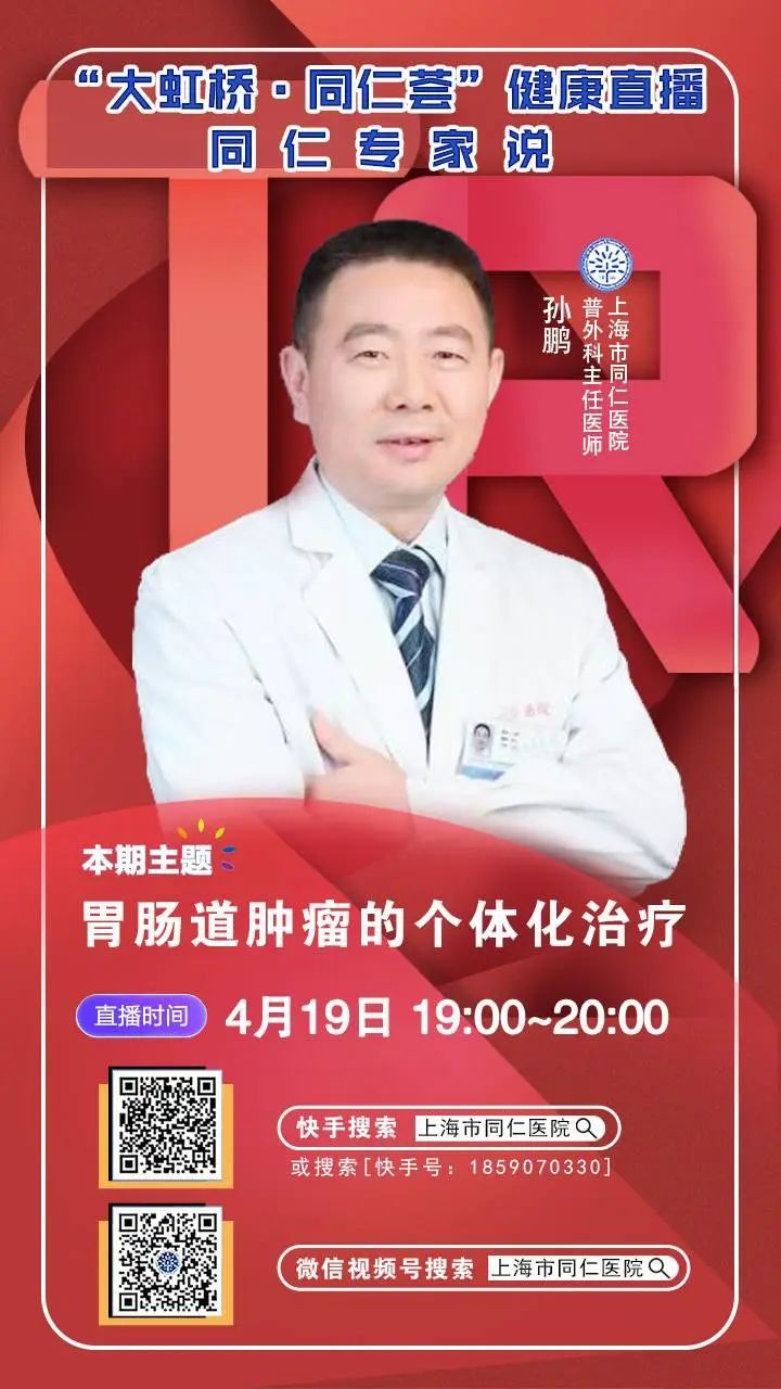 2023年4月19日,“大虹桥·同仁荟”健康直播,普外科专家孙鹏主任,就“胃肠道肿瘤的个体化治疗”的话题,对于胃肠道肿瘤患者的疾病治疗和管理进行了详尽介绍。
