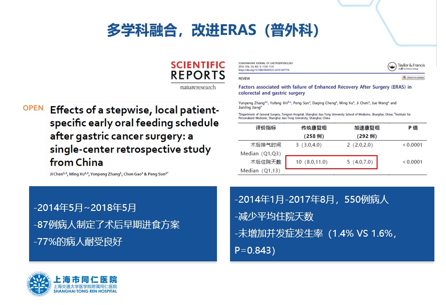 2014年开始上海市同仁医院普外科在传统的胃肠疾病诊治措施基础上引入了加速康复外科理念,针对消化道肿瘤患者拟定了合理的加速康复流程,并进行了为期3年的临床研究,得出了初步研究结果。