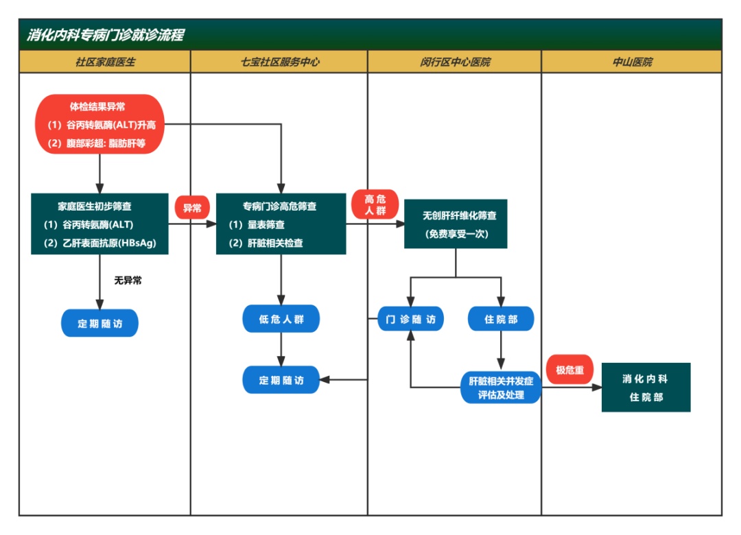 复旦大学附属闵行医院(中山医院闵行分院,闵行区中心医院)消化内科联合七宝社区服务中心将于2023年5月20日起开设消化内科专病门诊,以“慢性肝病与胃肠动力性疾病”为特色,主要围绕区域内体检异常人群的健康评估、慢性肝病高危人群早期筛查,依托“中山医院-闵行区中心医院-社区卫生服务中心”三级管理平台,为高危人群免费提供无创肝纤维化筛查一次。