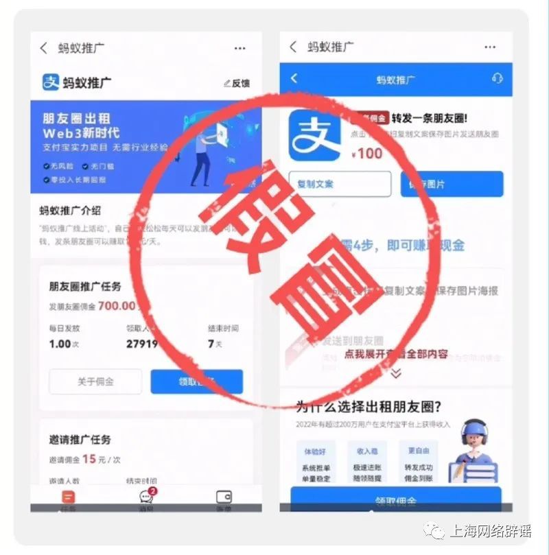 对此,支付宝明确表示,没有“蚂蚁推广”“支付宝推广”等项目,也没有举办过“朋友圈出租”等赚钱活动。以上活动均为诈骗。公众若扫描相关二维码,会进入诈骗团伙模仿微信、支付宝等风格伪造的网站,步步点击后可能导致信息泄漏或资产损失。