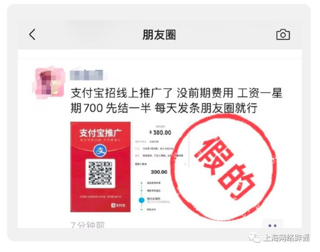 据悉,支付宝开放平台近日接到多名用户反馈称,在朋友圈等处看到号称通过“朋友圈出租”做推广任务的赚钱活动,并附带二维码,表示扫码后即可赚钱,还有“工资一星期700”“每天发条朋友圈就行”等噱头。这些活动打着“蚂蚁推广”或“支付宝推广”的旗号。用户希望求证真伪。