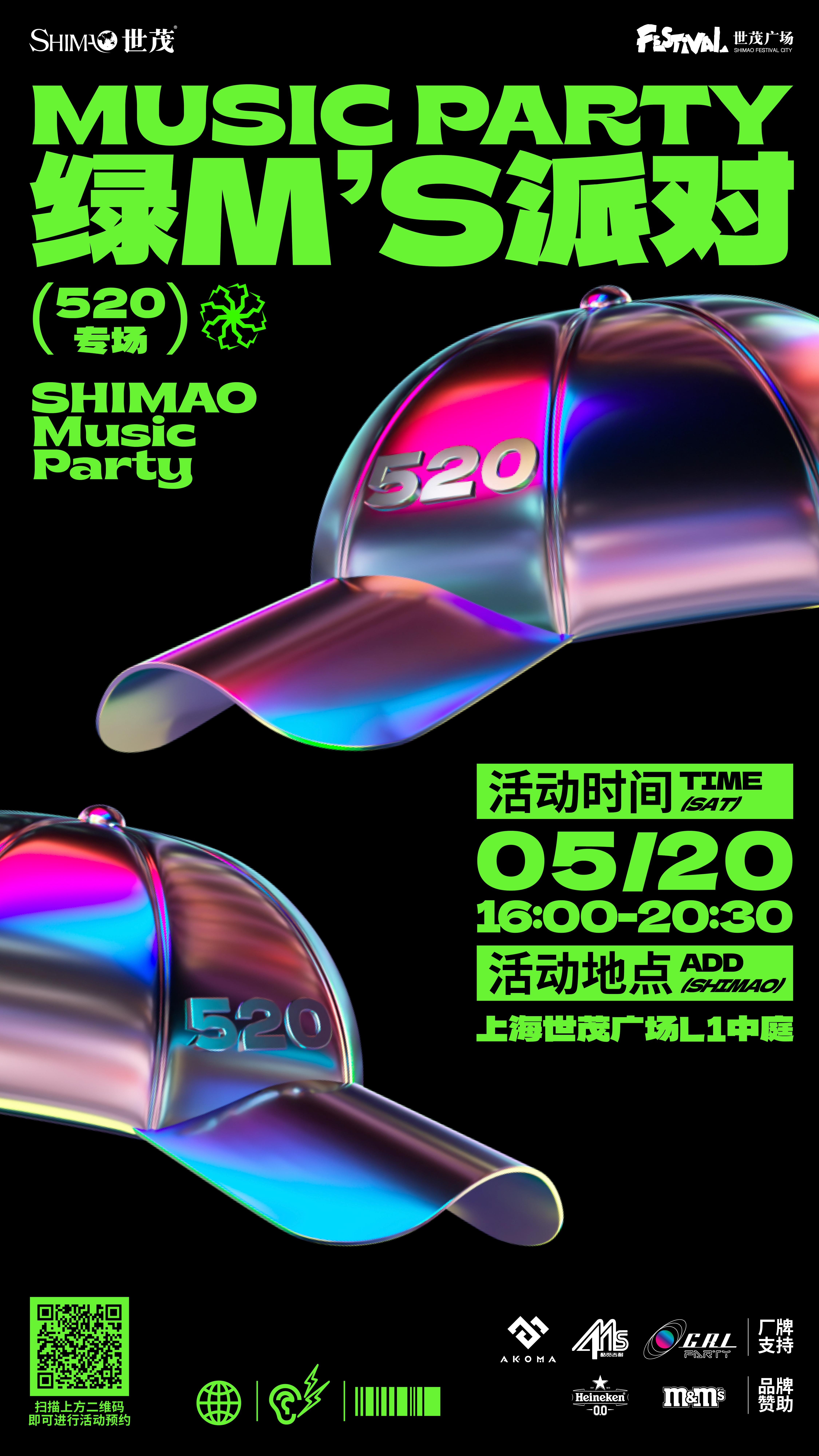 5月20日,“魔都潮流枢纽”联名魔都人气夜店品牌AKOMA,在上海世茂广场L1中庭打造「MakeSense 绿M’S音乐派对520专场」,以绿色为名,行“反叛”之事,在这个520为Z世代青年带来不一样的叛逆浪漫。同时,M&M’s巧克力豆、喜力啤酒等品牌也将联合支持此次音乐派对,持续“绿”动制噪,激燃南京东路商圈潮流活力。