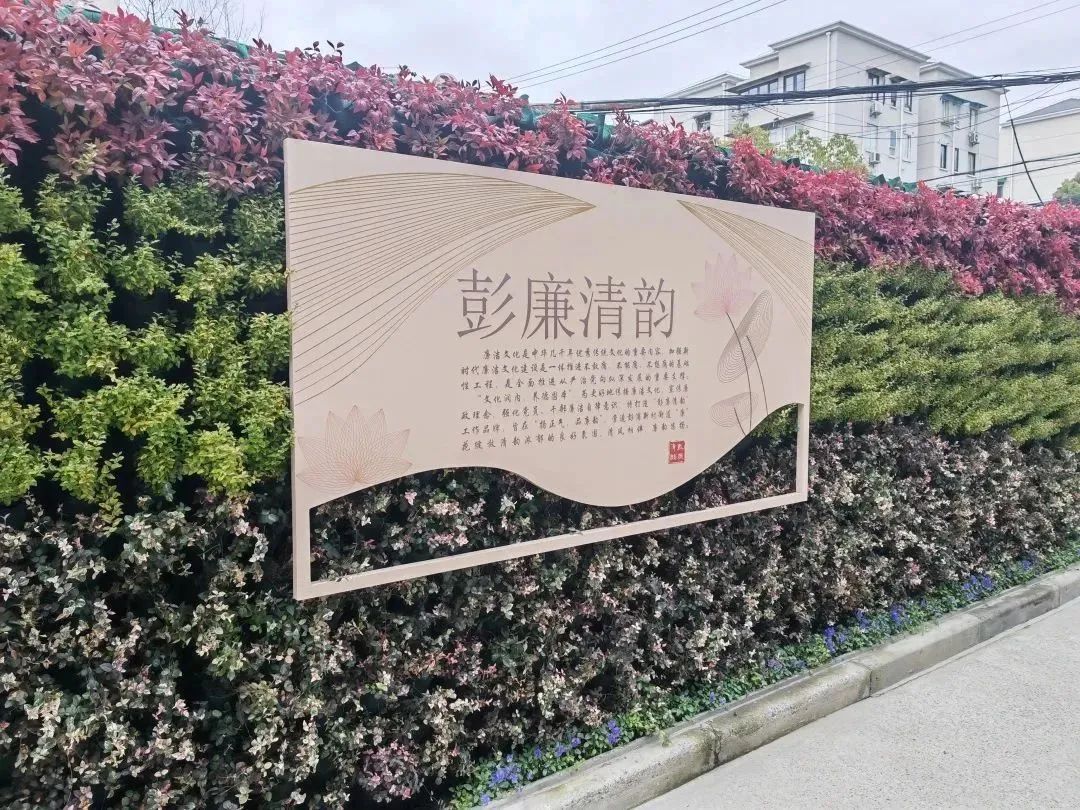 该处绿墙以廉政文化为主题,宣传道廉洁文化工作品牌:“彭廉清韵”,是街道党工委落实政治生态,加强反腐倡廉建设的宣传阵地。