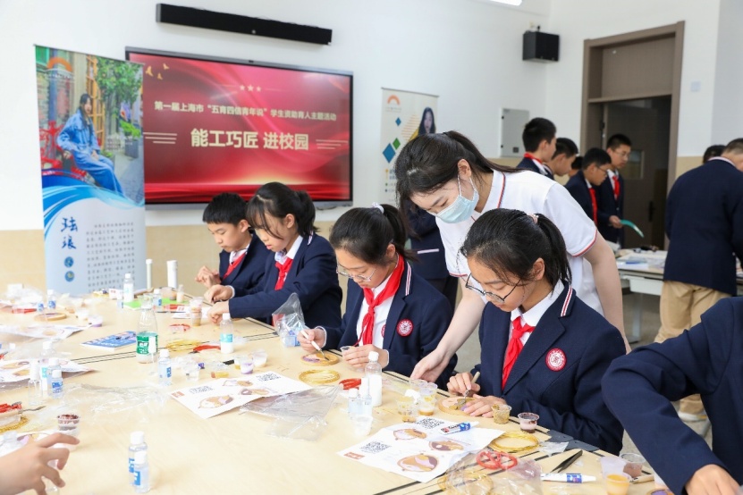 劳动创造幸福生活,劳动教育激发工匠精神,来自上海工程技术大学和上海工艺美术职业学院的同学们,通过机器人展示、航模队表演、世界技能大赛小讲堂、手工皮具制作以及珐琅版画展示等向中学生们生动表达了“技能让生活更美好”的新时代职业教育发展理念。