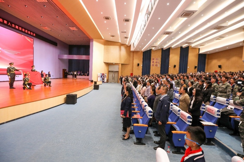 随着大中小学生护送国旗、共青团旗和少先队旗进入会场。现场高唱国歌后,大中小学生代表手拉手共同浇灌小树苗,本次活动拉开序幕。