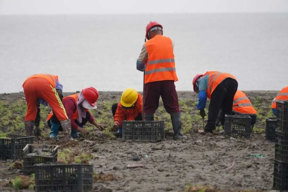 近日,在南汇东滩海边,上海海洋大学海洋生态与环境学院何培民教授团队的研究生李敏正在记录工人播撒和移栽盐地碱蓬等盐生植物的数据。“我们在播撒盐地碱蓬种子,推进上海滨海湿地碱蓬群落恢复关键技术研究项目,等到今年十月,就能在这里看到一片红色的‘海洋’。”