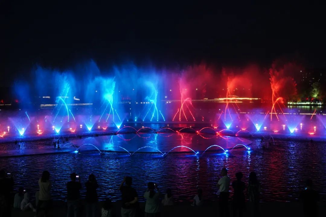晚上7点,夜幕降临,远香湖湖面流光溢彩、华灯璀璨,沪上最大规模户外水景演出登台助场。大型喷泉列阵、空中光束阵列及激光水幕的效果下,为观众展现出一幅嘉定文化的动人传奇画卷。嘉定本土动画《相思》用水幕秀的方式表现出来——《相思》以王维的同名诗为创作背景,讲述了嘉定名士王初桐和发小六娘青梅竹马、红豆定情的爱情故事。视觉、听觉盛宴,配合着应景的爱情主题,浪漫溢出远香湖畔。