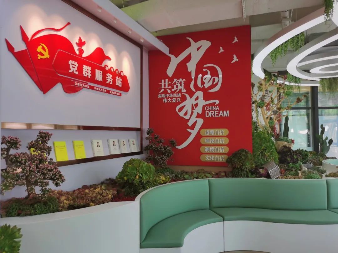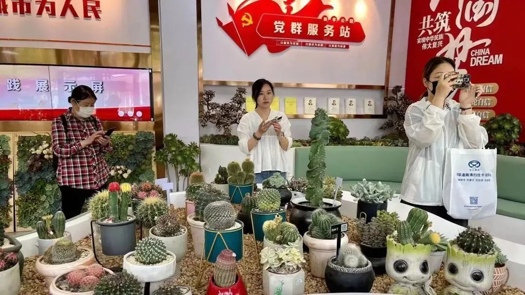 党群实践区将多肉植物融入到党群服务站中,结合红色主题文化墙,布景多采用红色系多肉品种。通过艺术化的手法布置,展现多肉顽强的生命力,象征着星星之火可以燎原。