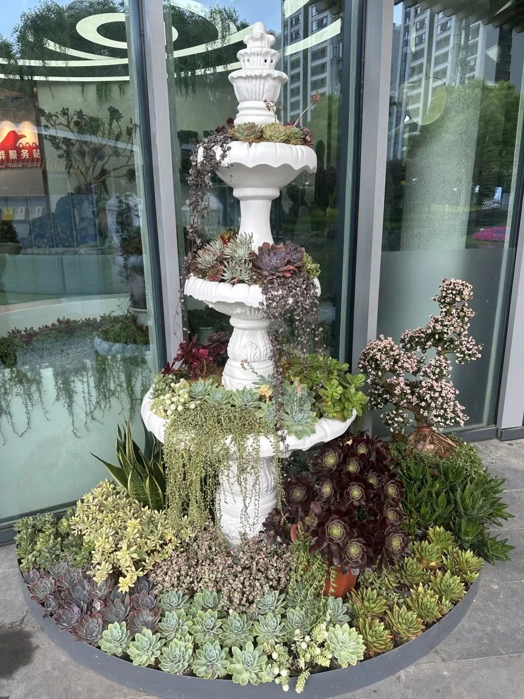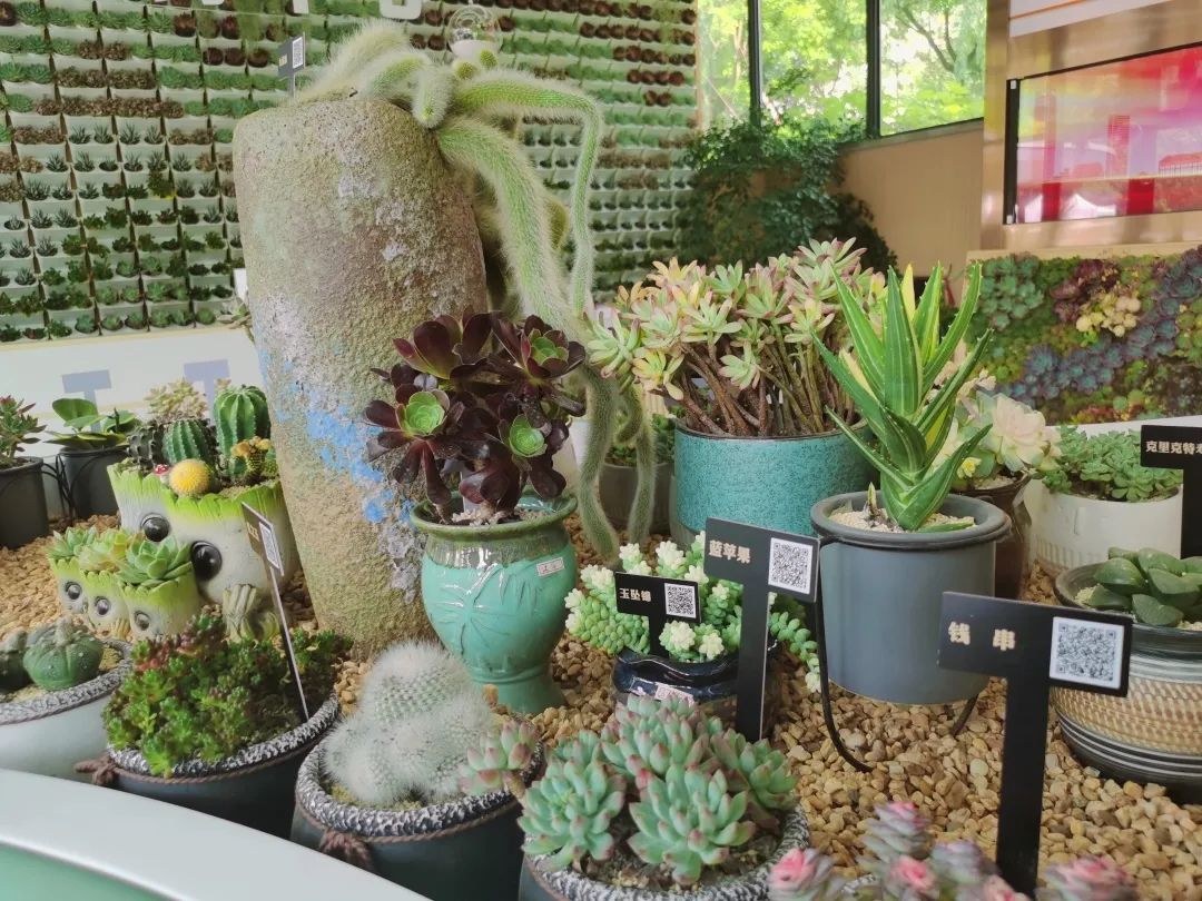 除了种类丰富,栽种多肉的花盆更是各具特色,有游船、喷泉、花洒、画架等造型,充满艺术氛围。并且盆中还插有介绍多肉种类和种植方法的二维码,手机扫码随时可以阅览。