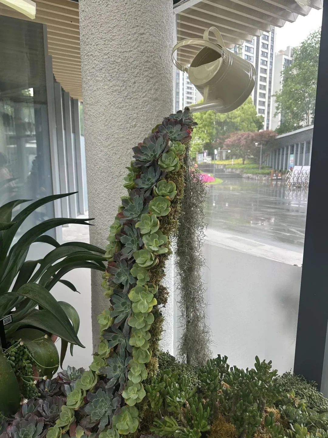 休憩观赏区将多肉引入到游客中心内,带给游客悠闲适意、清澄祥和的沉浸感。通过艺术手法用多肉和装置造景:取一壶“生命之水”浇灌在枯竭的沙地上,流经之处枯木逢春、生命绽放。让游客休憩之余能观赏多肉造景之美妙,感受日益美好的生活环境。结合精品多肉盆栽和休憩座椅的摆放,以及悬挂、攀援多肉景观,给游客营造舒适的观景和阅读环境。