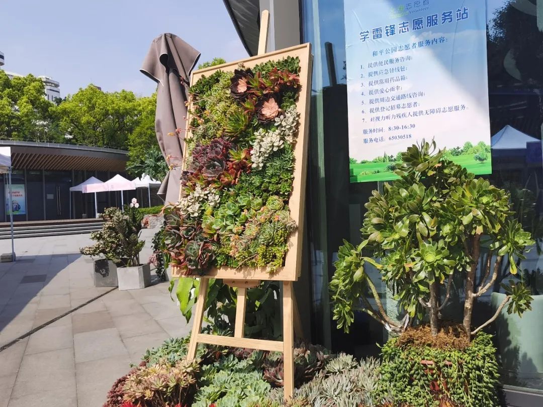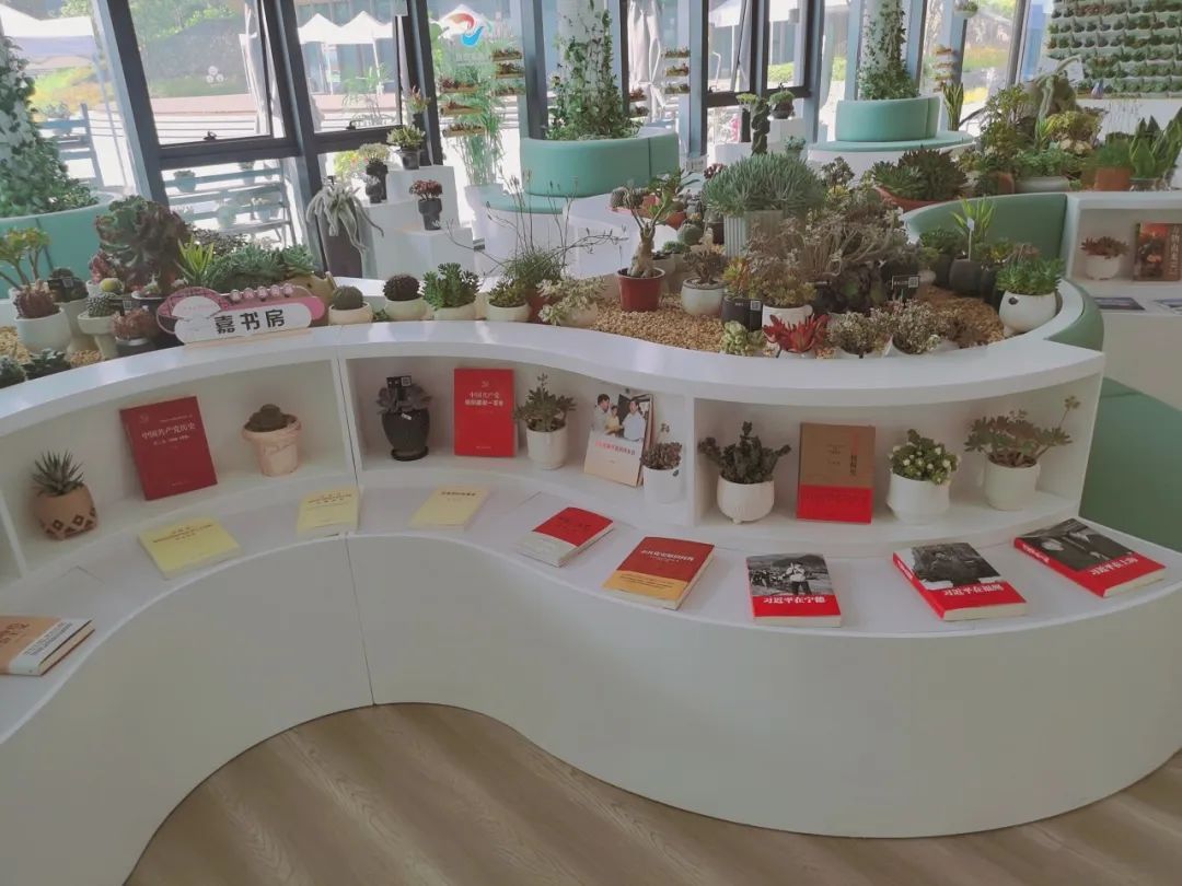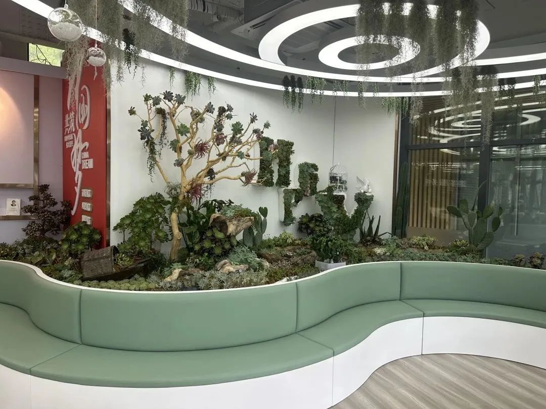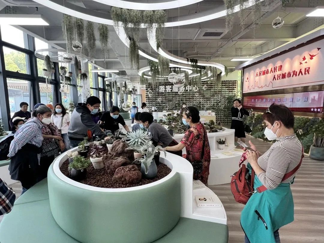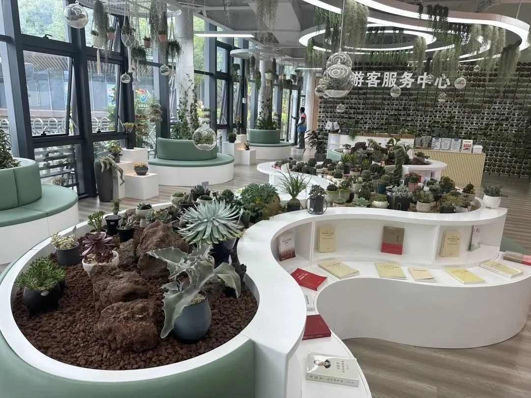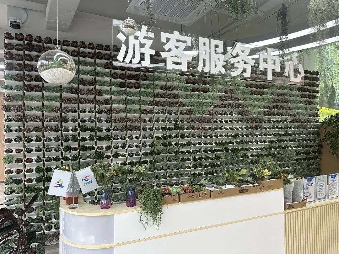 为民服务区通过小盆多肉植物艺术排列的背景墙,打造出含接待游客、访问咨询、阅读品鉴,接触自然和认知多肉植物等多功能一体化的特色游客服务中心。