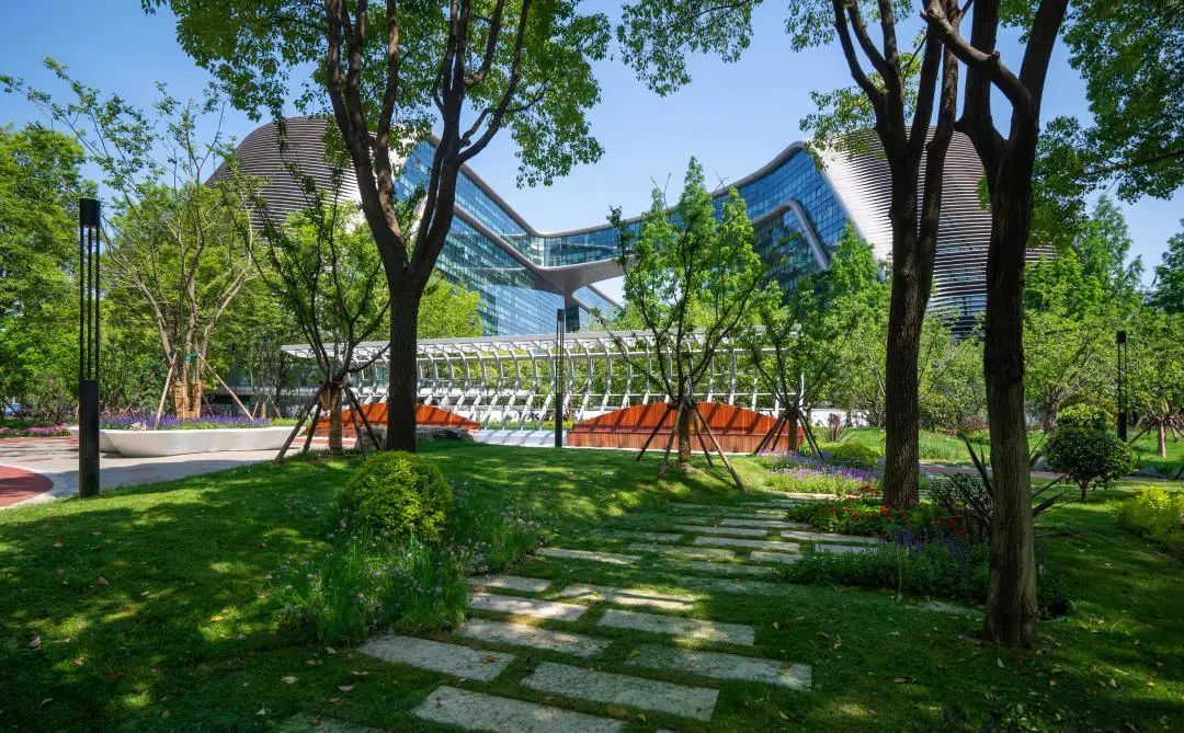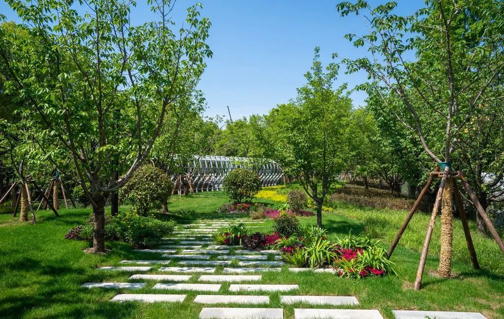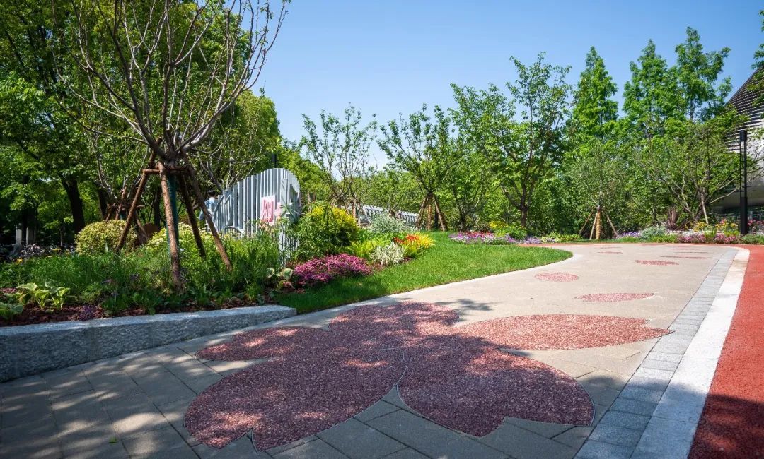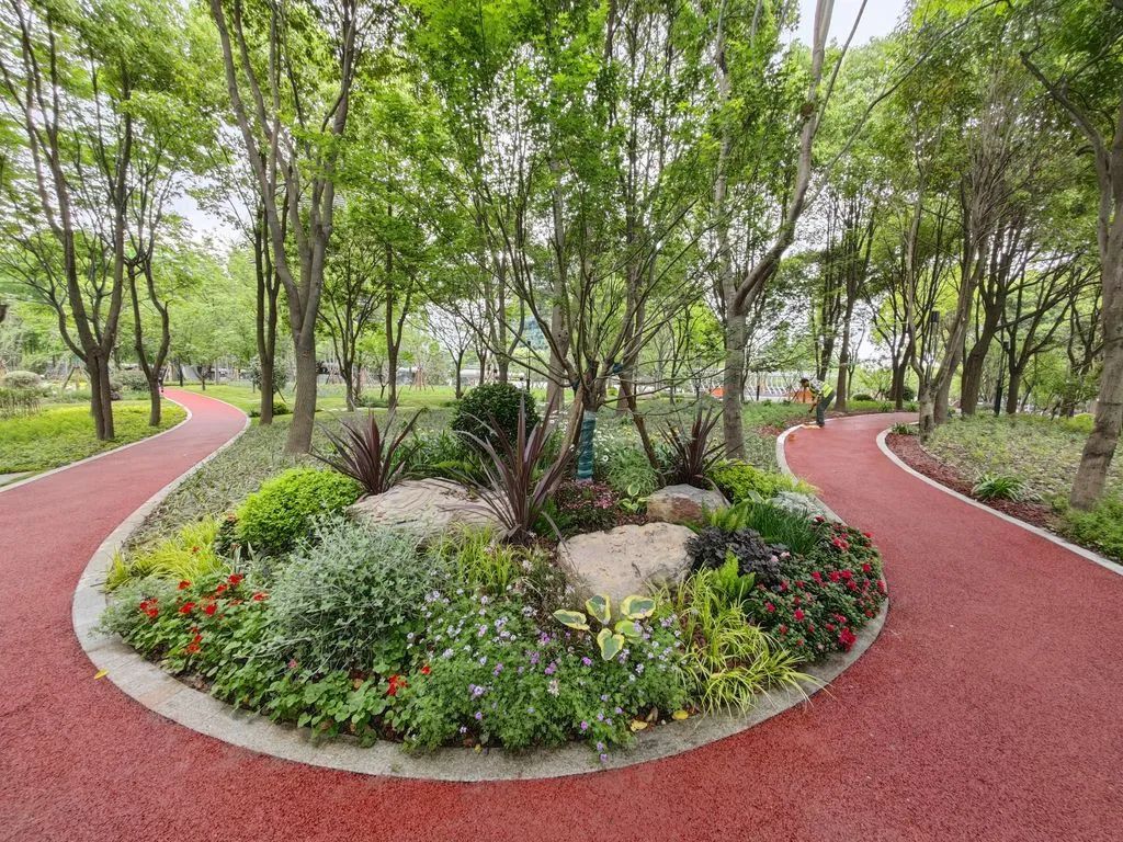 绿道内还增设特色汀步3条,点缀穿梭于草坪及林间,市民游客在林中悠闲漫步,沉浸在自然中,身边的微风阵阵,会感受到别样的轻松愉悦。行至园内中心处可见以异形花池、樱花雕塑灯为核心的休憩空间,沿路还布置有丰富花草的雨水花园及休闲廊架座椅,移步易景。