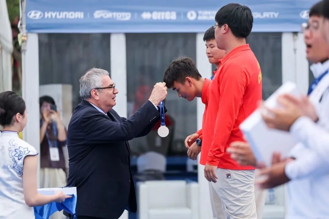中国队(左)获得男子反曲弓团体银牌,
