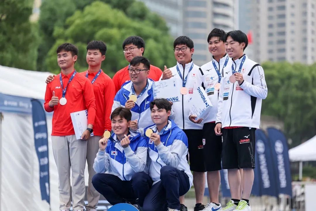 世界射箭联合会秘书长汤姆·迪艾伦(Tom·Dielen),国家体育总局射击射箭运动管理中心副主任、中国射箭协会副主席郑立勋,浦东新区区委常委、宣传部部长黄玮等与参赛选手合影留念