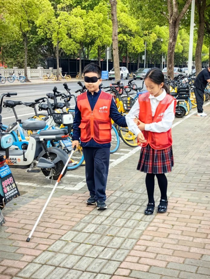 视障人士如何整理背包?口渴要喝水怎么办?如何使用手机、电脑等电子设备?在体验环节,小志愿者带上眼罩陷入黑暗中,在摸索中体验视障人士的日常生活,感受他们的难处。小志愿者还走出浦东图书馆,实地勘察周边盲道是否被占用,为视障人士出行提供便利。