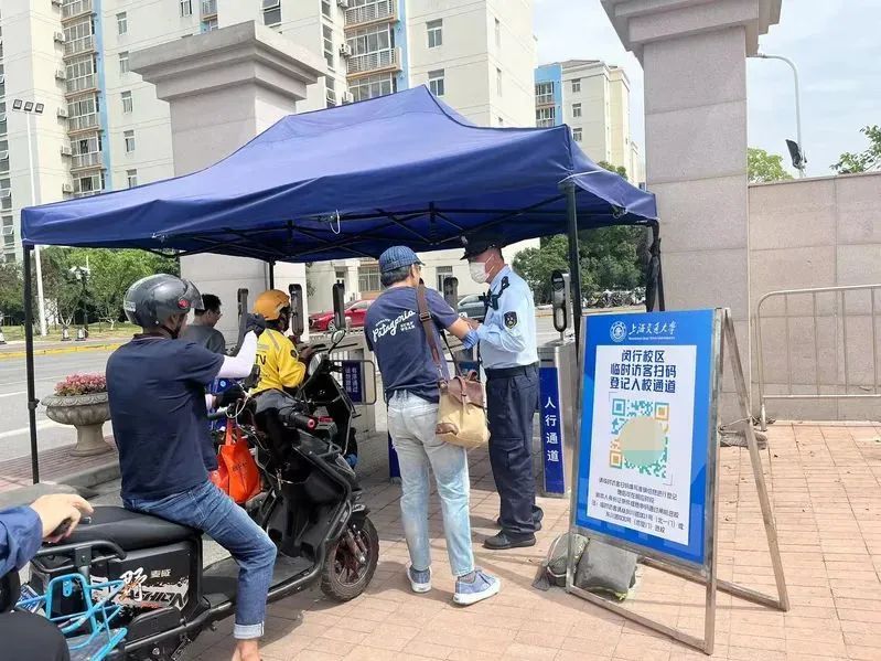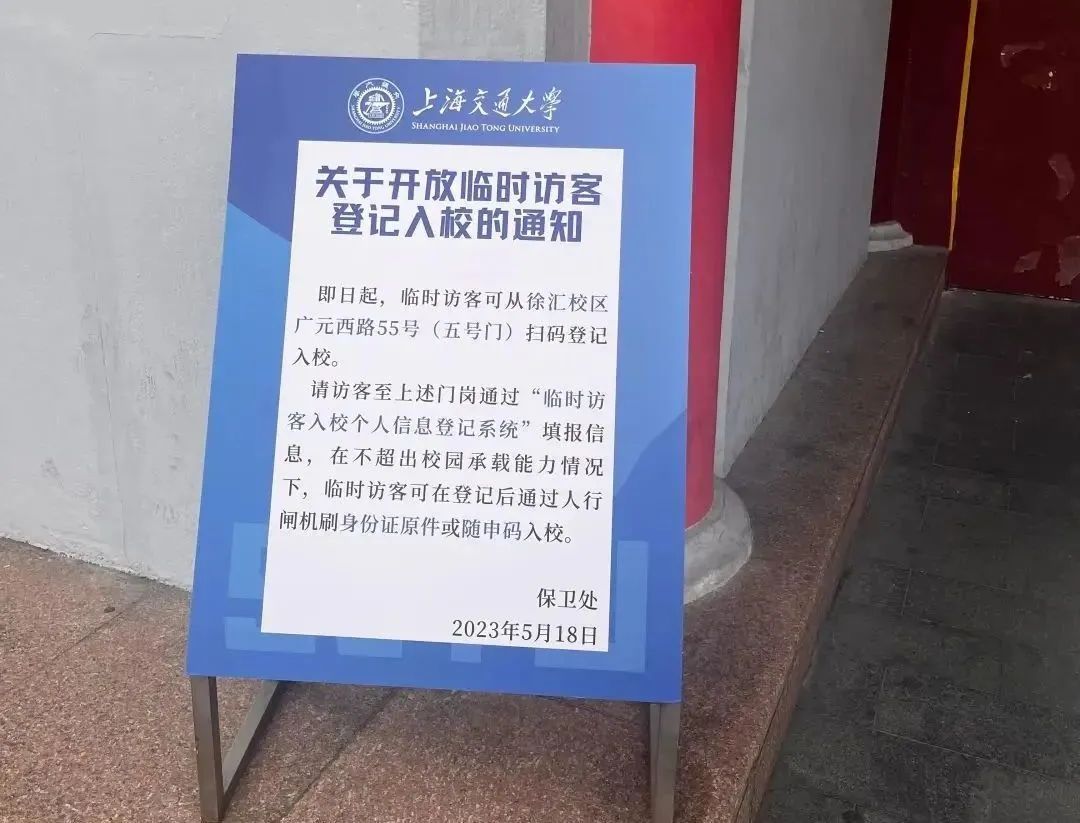 而在剑川路901号的交大闵行校区门口,临时访客扫码登记入校通道的告示牌也已树了起来。