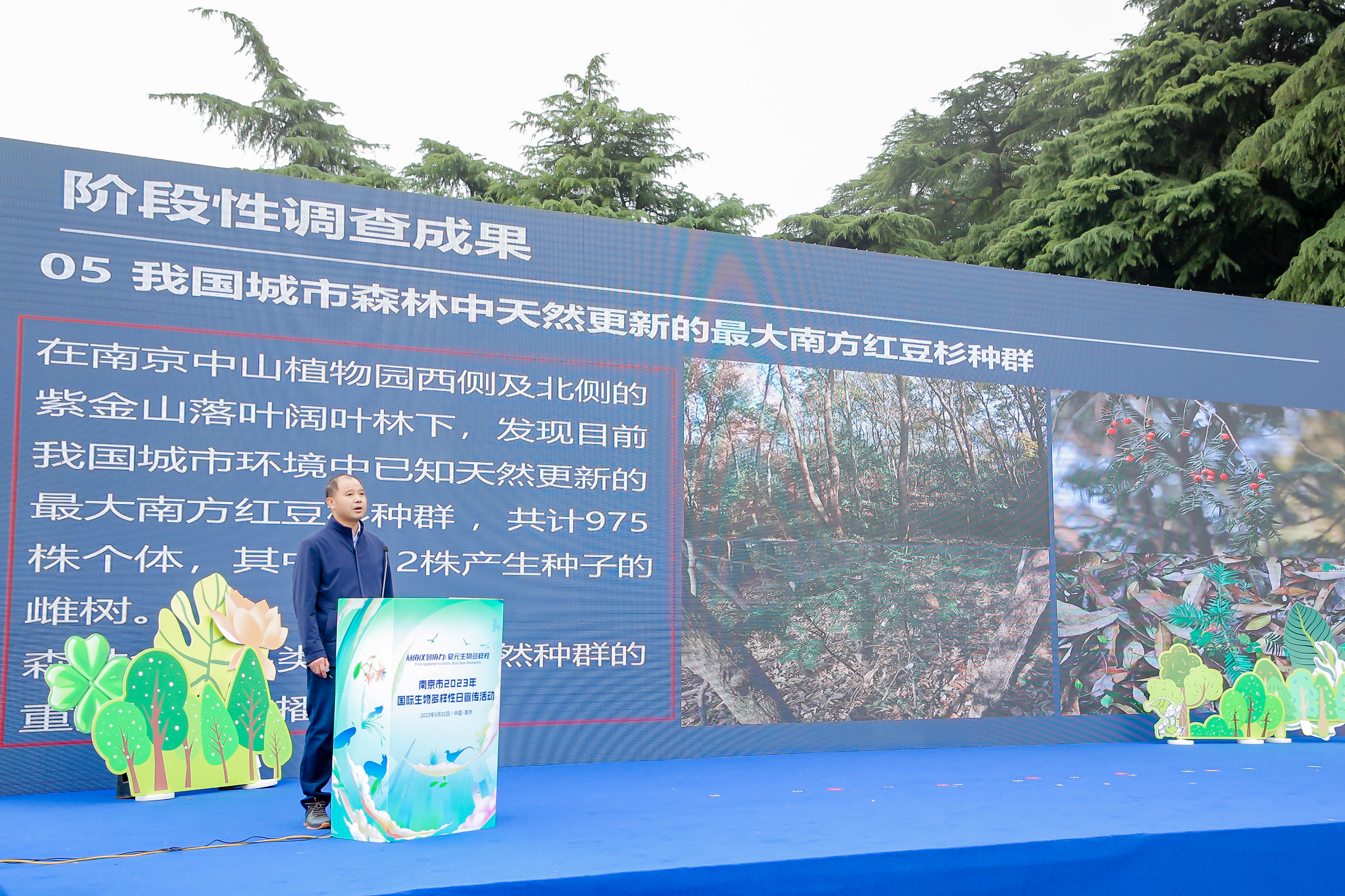 “大家请看,这是南京紫金山南麓里一处自然生长的南方红豆杉种群,也是江苏首次发现的南方红豆杉天然种群,更是迄今为止我国城市森林中天然更新的最大南方红豆杉种群。”活动现场,南京农业大学生命科学学院副教授李新华发布南京生物多样性调查阶段性成果,这项调查是南京农业大学受南京市生态环境局委托开展的。