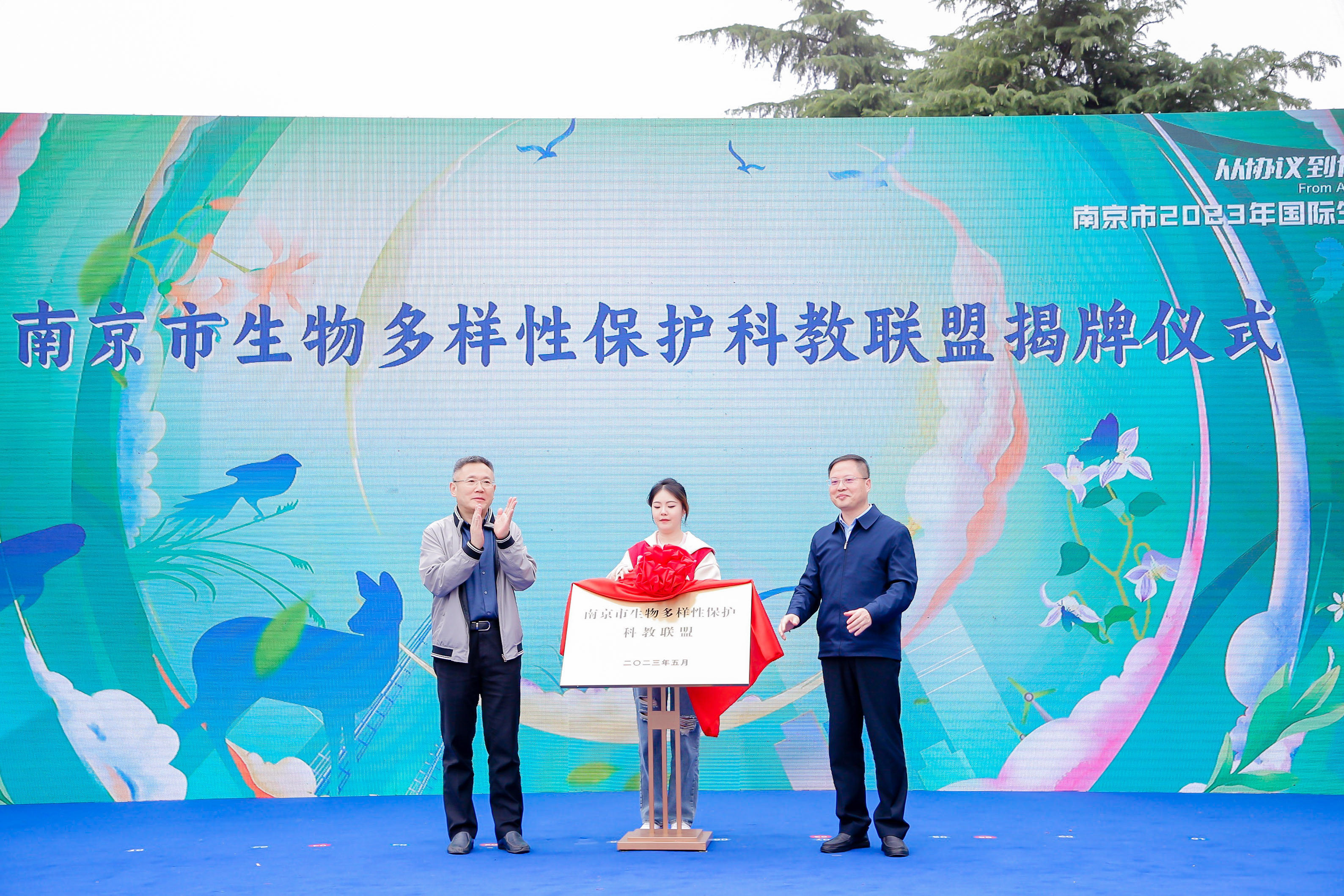 活动现场,南京市生态环境局局长李文青与南京林业大学党委书记赵茂程为南京市生物多样性保护科教联盟揭牌。