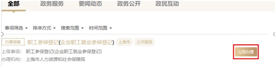 您可登录“一网通办”首页,在搜索框输入“企业职工就业参保登记”,点击右侧的“搜一下”;在搜索结果中找到“职工参保登记(企业职工就业参保登记)”,点击右侧的“立即办理”,系统将自动跳转至办理页面。